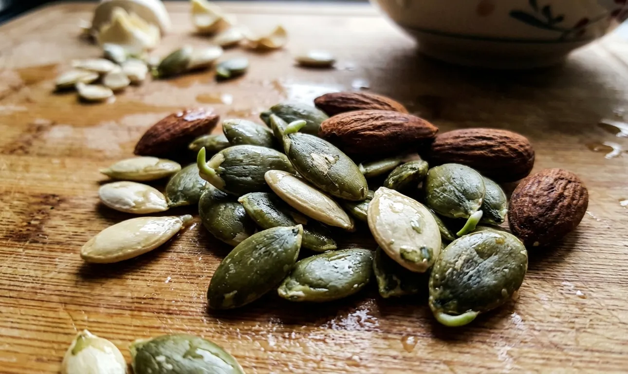 Zaužijte majhno pest surovih bučnih semen ali surovih mandljev.